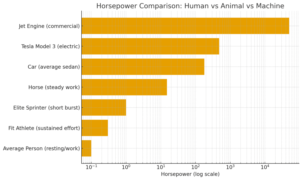 a fit athlete maybe 0.3 hp, and an elite sprinter for a few seconds, 1 full horsepower.Horsepower Comparison: Human vs Animal vs Machine